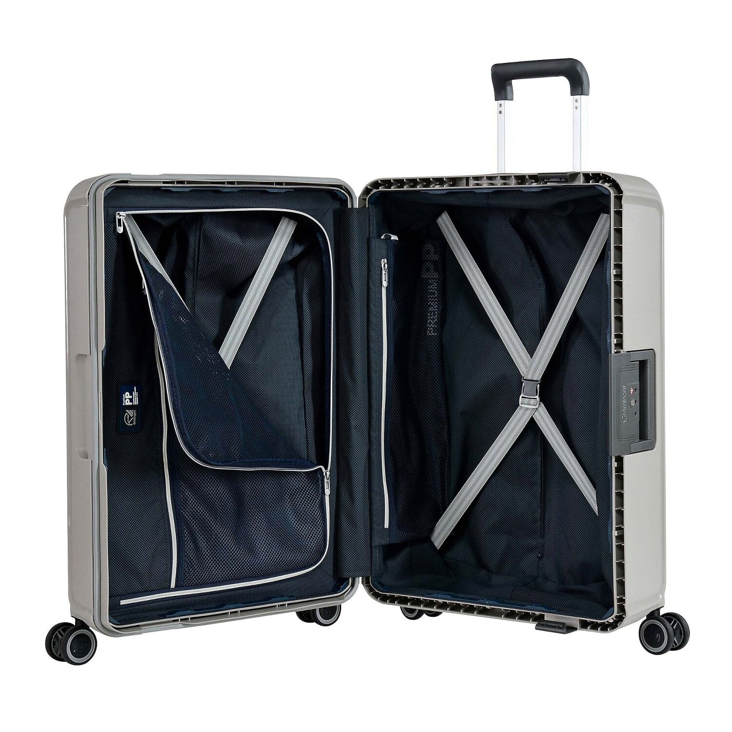 - Ausstattung: Wäschefach, Netzfach, Kreuzpackgurt, arretierbarer Griff